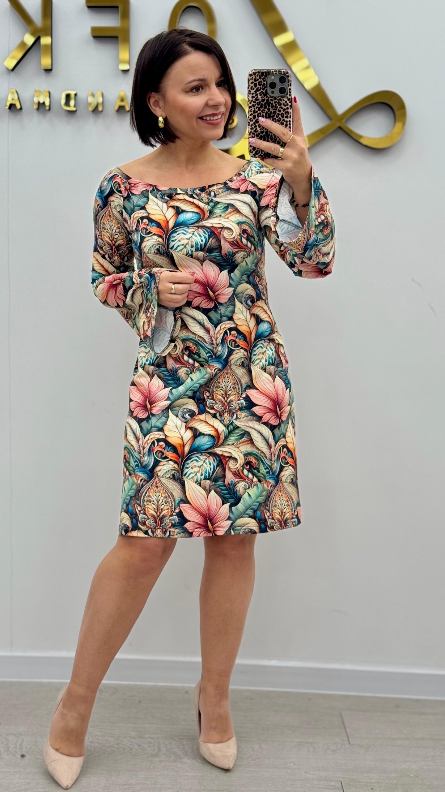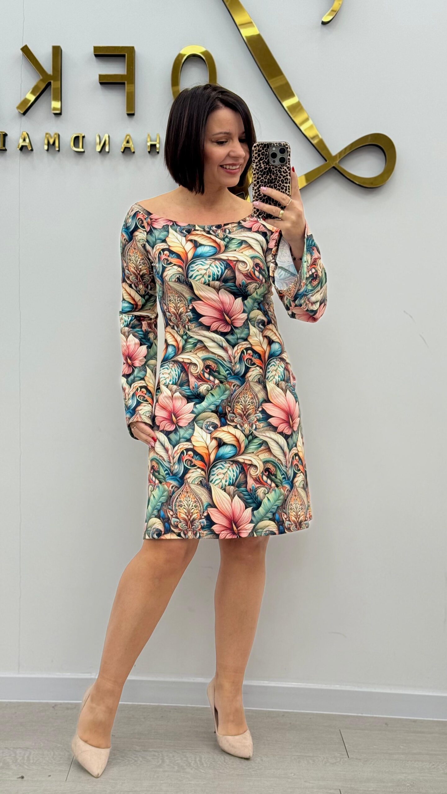 Poznaj sukienkę Labell od Zofka handmade – projekt stworzony dla kobiet, które pragną czuć się swobodnie, nie rezygnując przy tym z wyrafinowanego wyglądu. Bazą sukienki jest miękka i przewiewna dresówka pętelka, która świetnie układa się na ciele, ale to Ty decydujesz o jej ostatecznym charakterze, stając się współtwórczynią kreacji. Wybierz swój wymarzony print, a następnie zdecyduj o fasonie rękawów, który najlepiej podkreśli Twój styl: długi rozszerzany doda stylizacji nuty boho, długa bufka wprowadzi romantyczny akcent, długi prosty zapewni ponadczasową elegancję, a krótki rękaw będzie idealny na cieplejsze dni. Subtelny dekolt w łódkę pięknie eksponuje szyję i ramiona, czyniąc sukienkę Labell uniwersalnym elementem garderoby, który w zależności od dobranych dodatków zmienia swoje oblicze od casualowego po wizytowy.